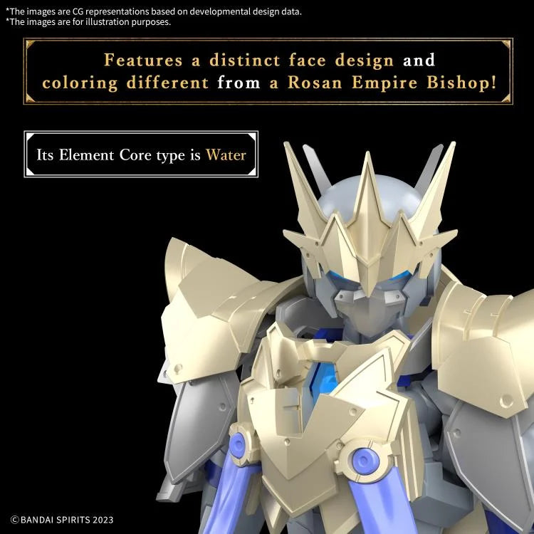 The set includes armor and weapon parts that transform the "Silhouette" [body] into the "Liber Bishop." Flexible movement is facilitated by a mechanism that connects shoulder and waist armor through joints on the back. The "Element Core" attribute of this model is "water," adding a thematic touch to your setup.