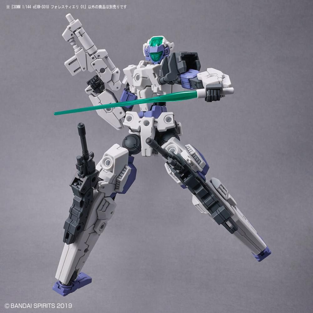 The 30 Minutes Missions series continues with eEXM-S01U Forestieri 01 in 1/144 scale! This set comes with pieces to build a rifle, beam sword, and Roy Roy; the rifle can be attached to the back while the beam sword handle can be attached to the back and thigh. It can be customized with other existing 30MM models for a different look.