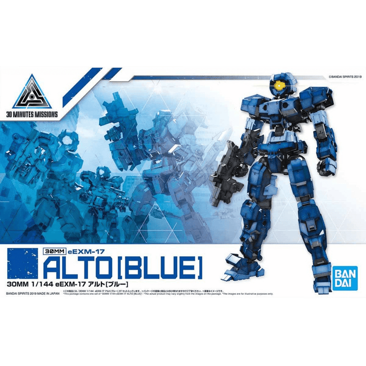 From the “30 MINUTES MISSIONS” with the simple structure BANDAI SPIRITS original robot plastic model series that is easy to assemble, “eEXM-17 Alto ” comes in 1/144 scale. ■ Intuitive, easy-to-understand runner arrangement and simple parts configuration. About 80 parts easy! ■ As assembly is easy, we can make a lot! I want to collect a lot! ■ Deploy multiple color variations in the same aircraft. You can enjoy your favorite coloring even without painting. ■ We adopt joint structure common to series. It is possible to change units or replace parts even with different aircraft. ■ Customization is possible by hard point of 3mm axis provided in each place! ■ Armed with short rifle and knuckle guard. ■ Equipped with a backpack equipped with hard points. ■ One small-sized support mechanism "Roy Roi" that can be combined with the main unit is included. Accessories: ■ Sub machine gun × 1 ■ Icon mechanism × 1 ■ backpack × 1 ■ Knuckle × 1 Item content: ■ Sprue × 4 ■ Marking seal × 1 ■ Manual × 1 dummy text of the printing and typesetting industry. Scale: 1/144 Item Size/Weight : 29.8 x 18.8 x 4.7 cm / 197g Release Date: Late Jun., 2019