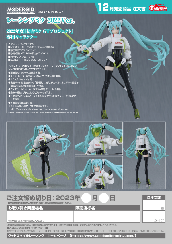 A MODEROID plastic model of the official character of the 2022 Hatsune Miku GT Project! The official character of the 2022 Hatsune Miku GT Project, Racing Miku 2022 Ver., is now a plastic model!