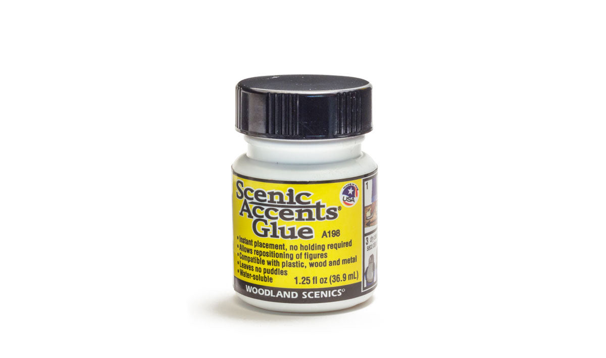 Scenic Accents Glue is specially formulated for instant placement of figures with no holding required and allows for easy repositioning. The no-drip, no-mess adhesive dries clear with no puddles or residue. Water soluble, high-tack and compatible with plastic, wood and metal. 1 fl oz (29.5 mL)