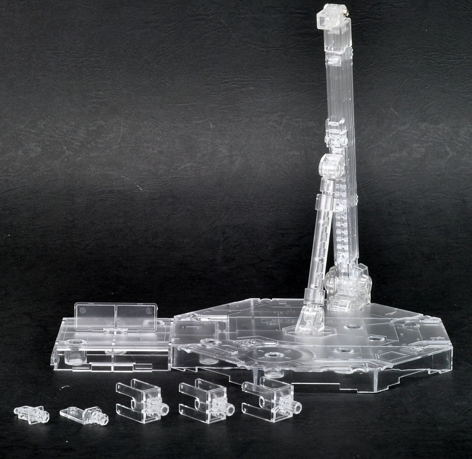 Action Base 1 is a line of plastic display stands for Gunpla kits and other mecha kits by Bandai. First introduced in 2006, an Action Base allows Gunpla kits to be displayed in aerial poses. Each Action Base comes with an arm that can be adjusted in height and angle, as well as different adapters for older Gunpla kits that do not have peg holes available. The bases are modular and can connect to other Action Bases to display multiple Gunpla kits.