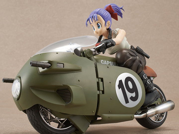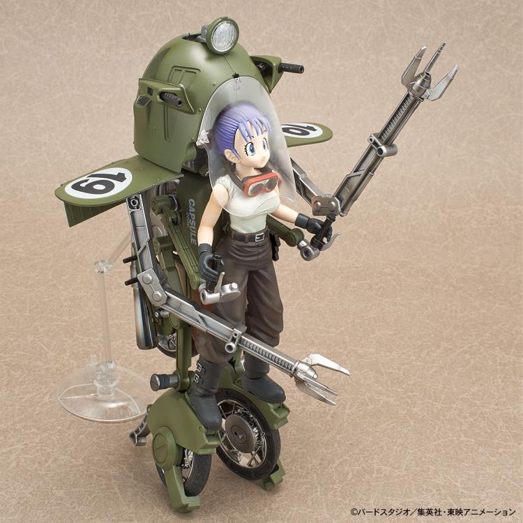 An amazing vehicle used by Bulma to search for the Dragon Balls! It includes transforming abilities that allow it to change between motorcycle into bi-pedal and trike modes. Also included are a Bulma figure that has different hand and leg parts to allow her to pilot the controls for each mode and a display base.