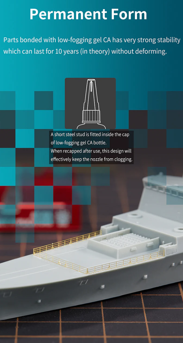Parts bonded with low-fogging gel CA have a very strong stability which can last for 10 years (in theory) without deforming.