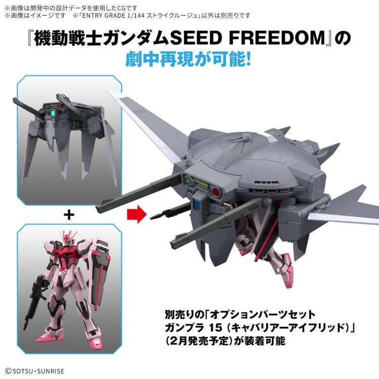 The model is designed with a range of motion that supports bold and dynamic poses, allowing you to recreate some of the most iconic action scenes from the series. For those looking to expand their display options, the ENTRY GRADE Strike Rouge is compatible with optional parts sets. The separately sold "Optional Parts Set GUNPLA 15 (Cavalier Eyefrid)" can be installed to replicate scenes from Mobile Suit Gundam SEED FREEDOM, while the "Optional Parts Set GUNPLA 01 (Ale Striker)" can also be added for additional customization.