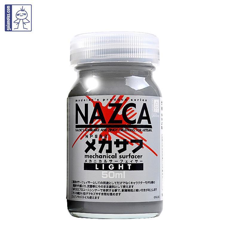 This surfacer can also be used a paint. It's perfect for mecha joints, internal mechanisms, weapons and more! Thinning with NP003 Pro Use Thinner is recommended for optimal strength and adhesion. Fill fine scratches and gaps with fine particles. Can also be used with resin garage kits. Before application, remove mold release, oil, dust, etc from your desired surface. Please mix well before use for best results. For best results use the NP003 Pro Use Thinner. However Gaia Notes Lacquer Thinner will work too. NAZCA Mechanical Surfacer is specially formulated to be darker than normal surfacers. This allows it to be used as ÒprimerÓ and ÒcolorÓ at the same time. These revolutionary surfacers are perfectly suited for internal mechanisms, frames and weapons. Parts that previously required priming can not be completed in a single layer. By using less layers, chipping/rubbing on mobile joints is reduced and your work time is shortened. Volume: 50 ml (1.7 oz) **ATTENTION** This item is considered to contain Ò Hazardous MaterialsÓ by shipping companies. Due to its flammable properties, The Gundam Place Store LLC can only ship this item to the 48 continental states through Surface Only. Unfortunately shipment of this item to non-continental USA states (Hawaii and Alaska) and international (Canada and Mexico) is not allowed. For ages over 15. You may also choose to wear gloves if you have a history of skin reactions and we recommend washing skin after contact. This product is highly flammable. Please keep it away from open flame and excessive heat. Handle with care. Keep out of reach of children. Do not puncture. The item pictured is a sample. Please understand the items included may change and the actual product may vary.