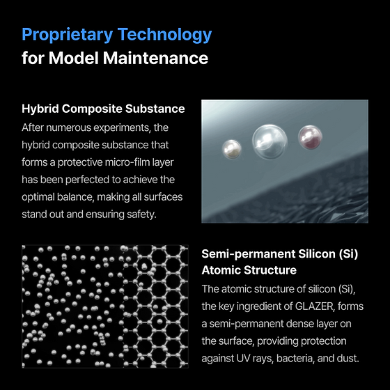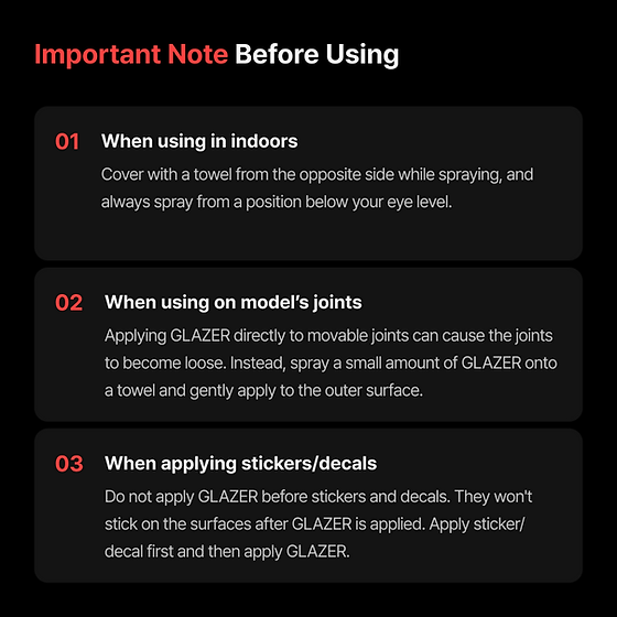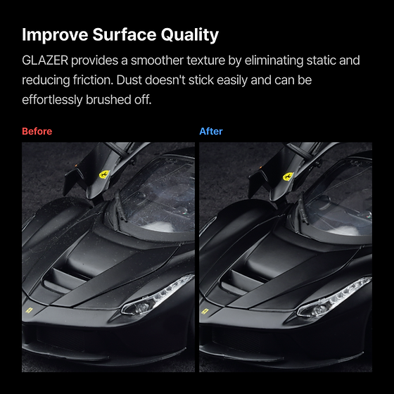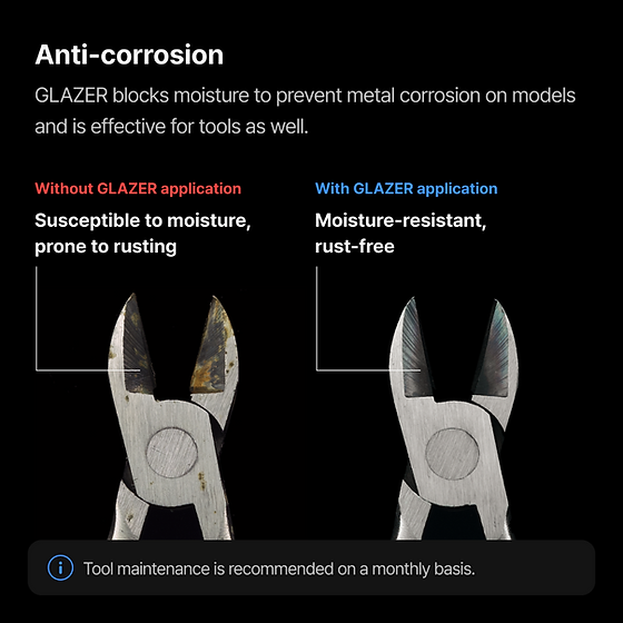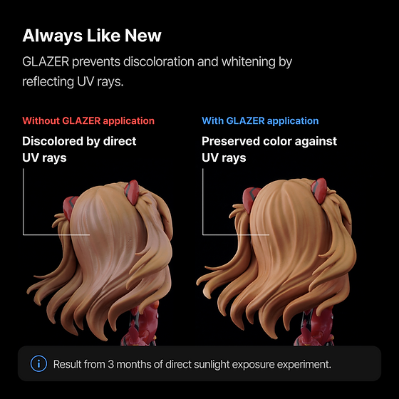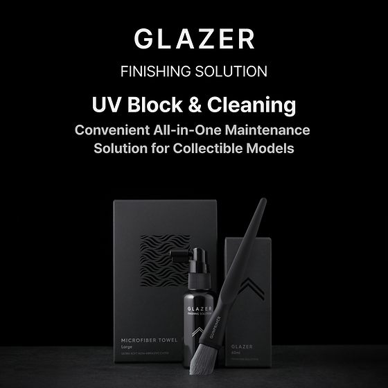 GLAZER is the first product ever created specifically for the maintenance of models and collectible figures. Using "Nanoparticle Silicon," it forms a thin protective layer that helps preserve a long-lasting, high-quality surface by guarding against UV-induced discoloration. Additionally, it reduces diffuse reflections on both matte and glossy surfaces while enhancing contrast for a more defined appearance. Its simple and easy application method ensures a hassle-free experience.