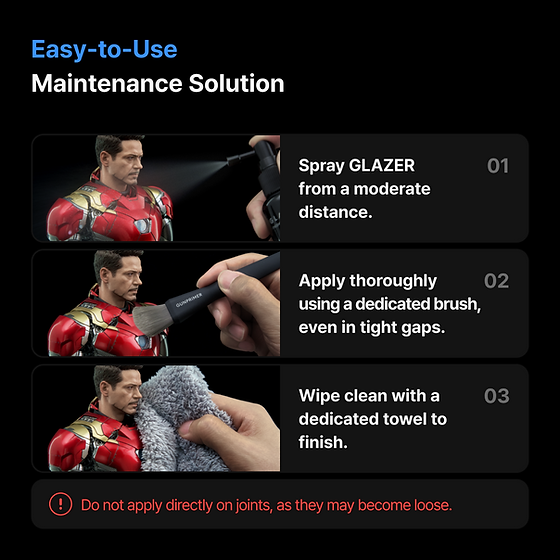 Tested free of harmful substances, it can be safely applied to any surfaces including glass and acrylic display cases to prevent dust adhesion, fingerprints, water stains, static, and minor scratches. GLAZER is the ultimate, a must-have maintenance agent for all hobby collectors