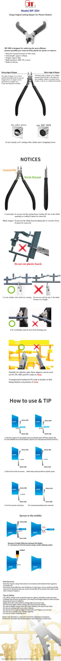 Material Special Steel (41xx steel; CrMo Steel) Measurement system Imperial (Inch) Handle Material Soft Grip Plastic Jaw Surface Small Bevel Place of Origin Taiwan, China Brand Name Good Tools Model Number MP-30H Application Cutting PP,PS,ABS,PE below Ø3.0 mm; Plastic ; Models ; Handicraft ; Gundam ; D.I.Y. Thickness 6.0mm Spring Action yes Surface treatment Polish Technics Forging