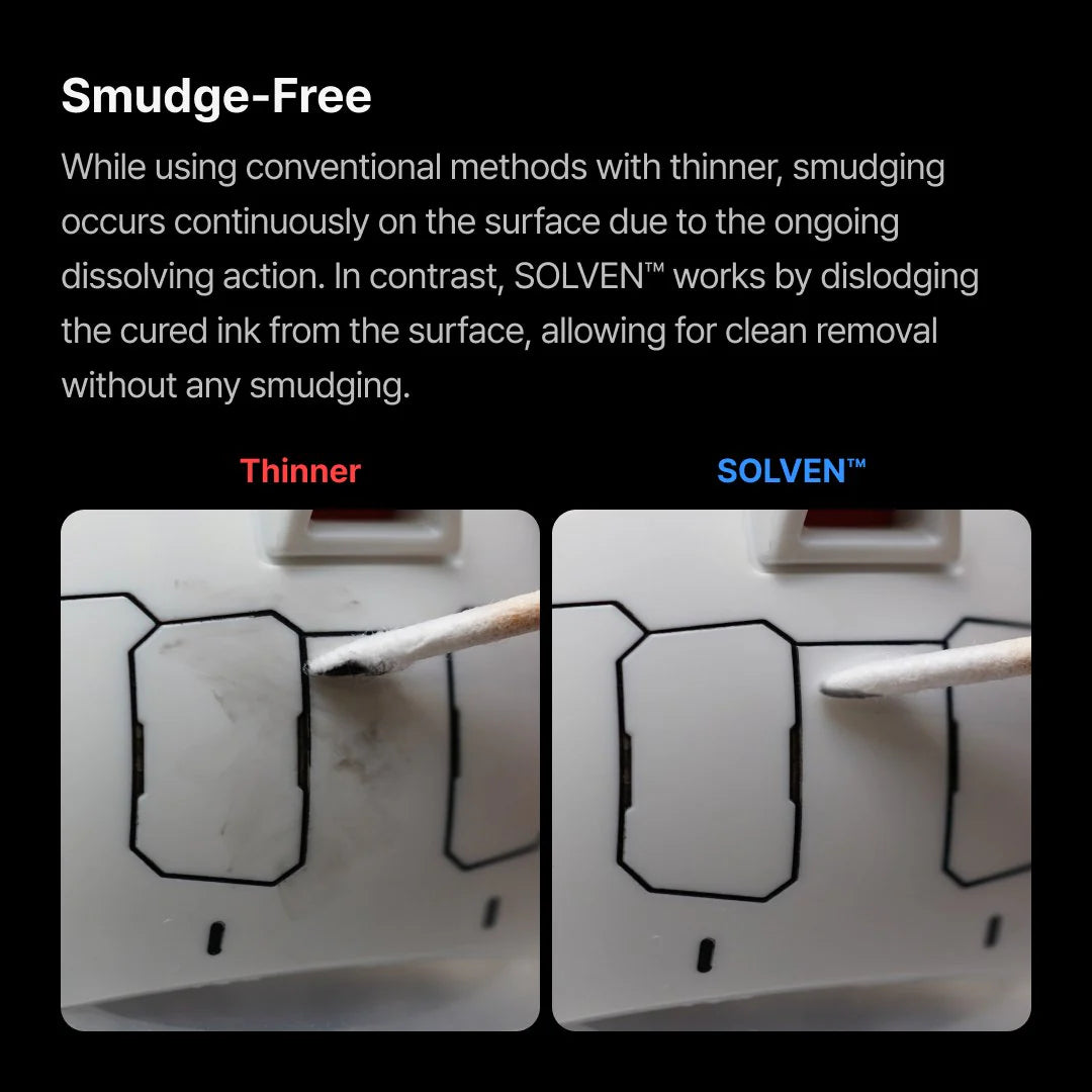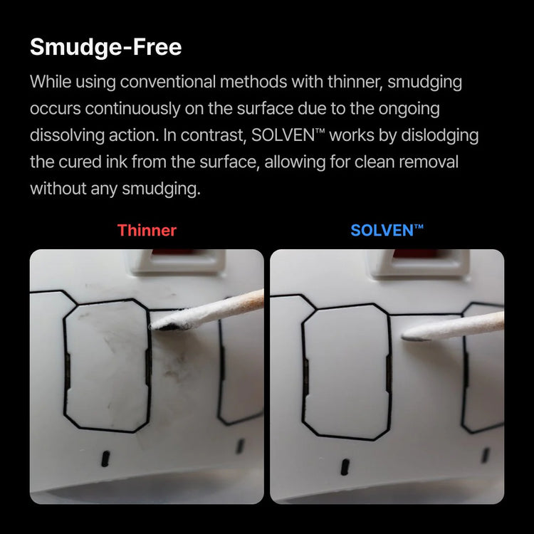 SOLVEN™ is a colorless and odorless solution specifically formulated for panel line cleaning. Unlike traditional enamel thinners, which often leave smudges due to their continuous dissolving action, SOLVEN™ effectively dislodges cured ink without smearing, ensuring a clean finish every time. Its balanced dissolving power enables rapid ink stain removal, eliminating the long drying times typically associated with conventional thinners.