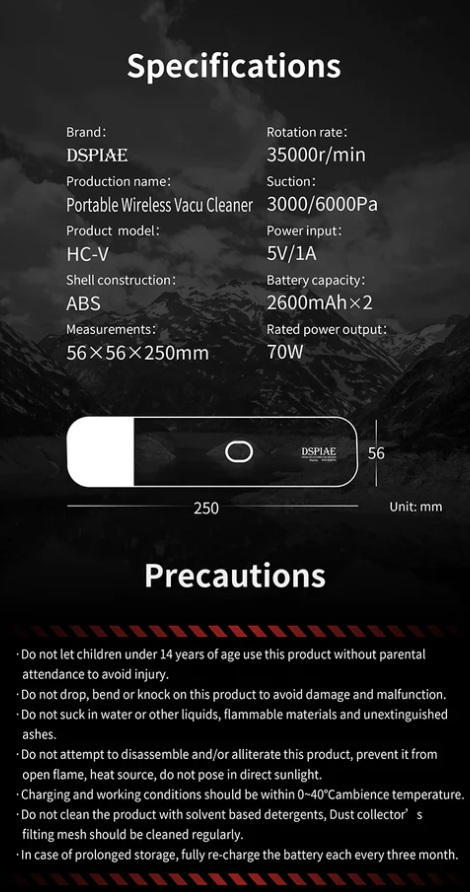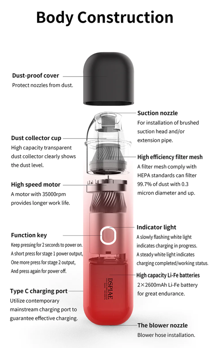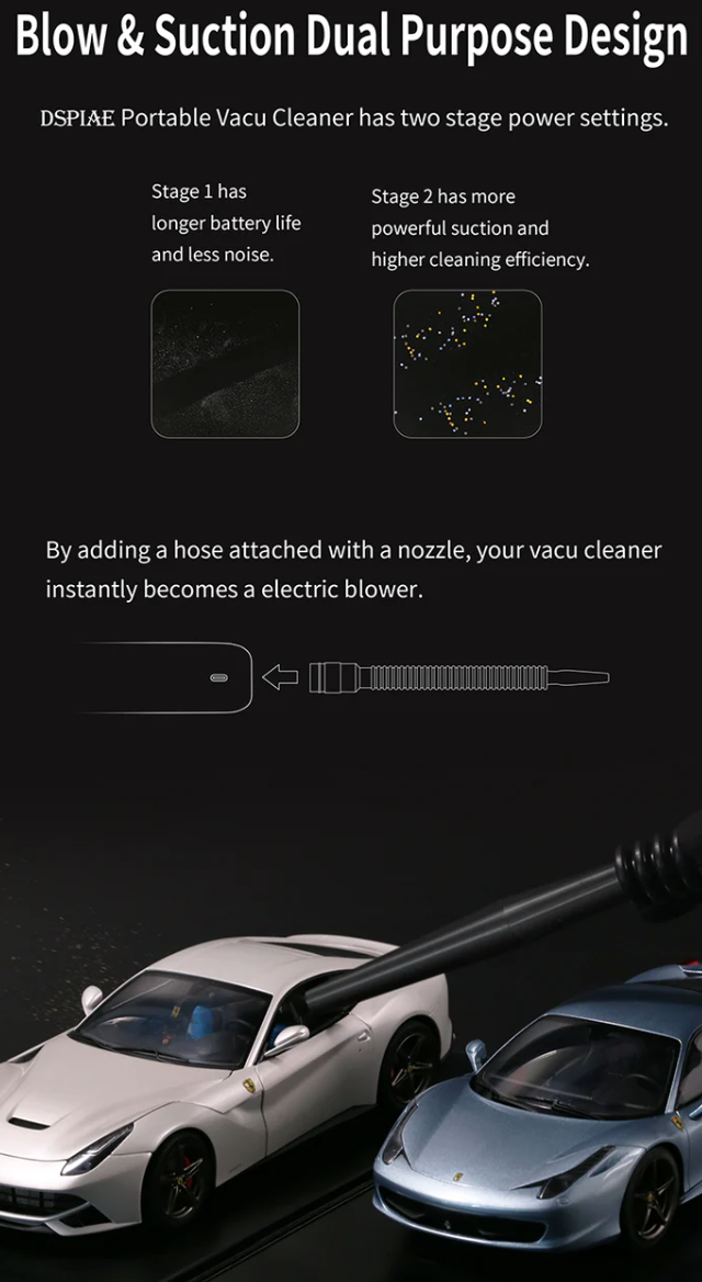 Blow & Suction dual purpose design: DSPIAE portable Vacuum Cleaner has two stage power settings. By adding a hose attached with a nozzle, your vacuum cleaner instantly becomes a electric blower.