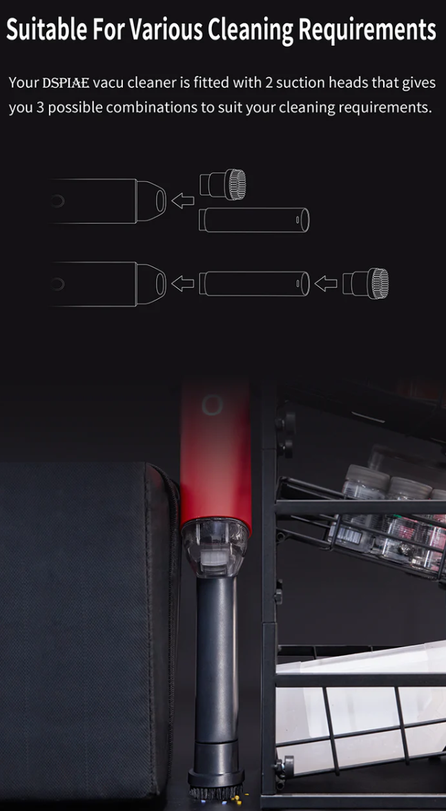 Suitable for various cleaning requirements: Your DSPIAE Vacuum Cleaner is fitted with 2 suction heads that gives you 3 possible combination to suit your cleaning requirements.