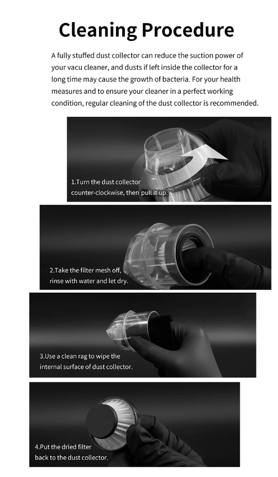 A fully stuffed dust collector can reduce the suction power of your vacuum cleaner, and dust if left inside the collector for a long time may cause growth of bacteria. For your health measures and to ensure your cleaner in a perfect working condition, regular cleaning of the dust collector is recommended.