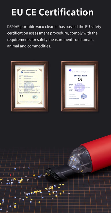 DSPIAE portable vacuum cleaner has passed EU safety certification assessment procedure, comply with the requirements for safety measurements on human, animal and commodities.