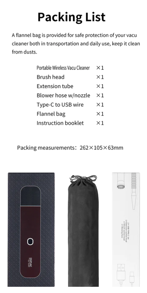 A flannel bag is provided for safe protection of your vacuum cleaner both in transportation and daily use, keep it clean from dust.
