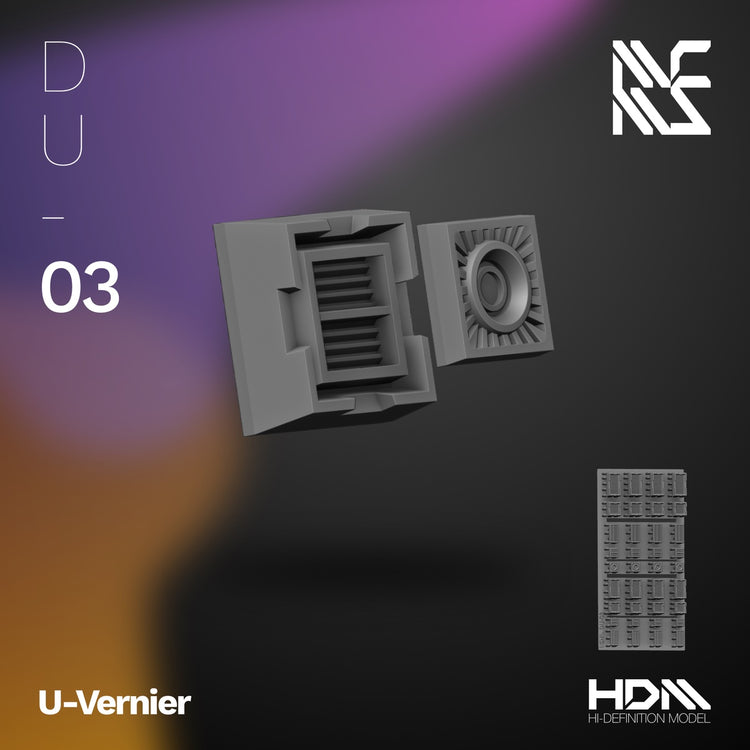 Includes modular vernier detail for mecha models and diorama pieces, includes different sizes and shapes for increased compatibility. Compatible with DU-04.