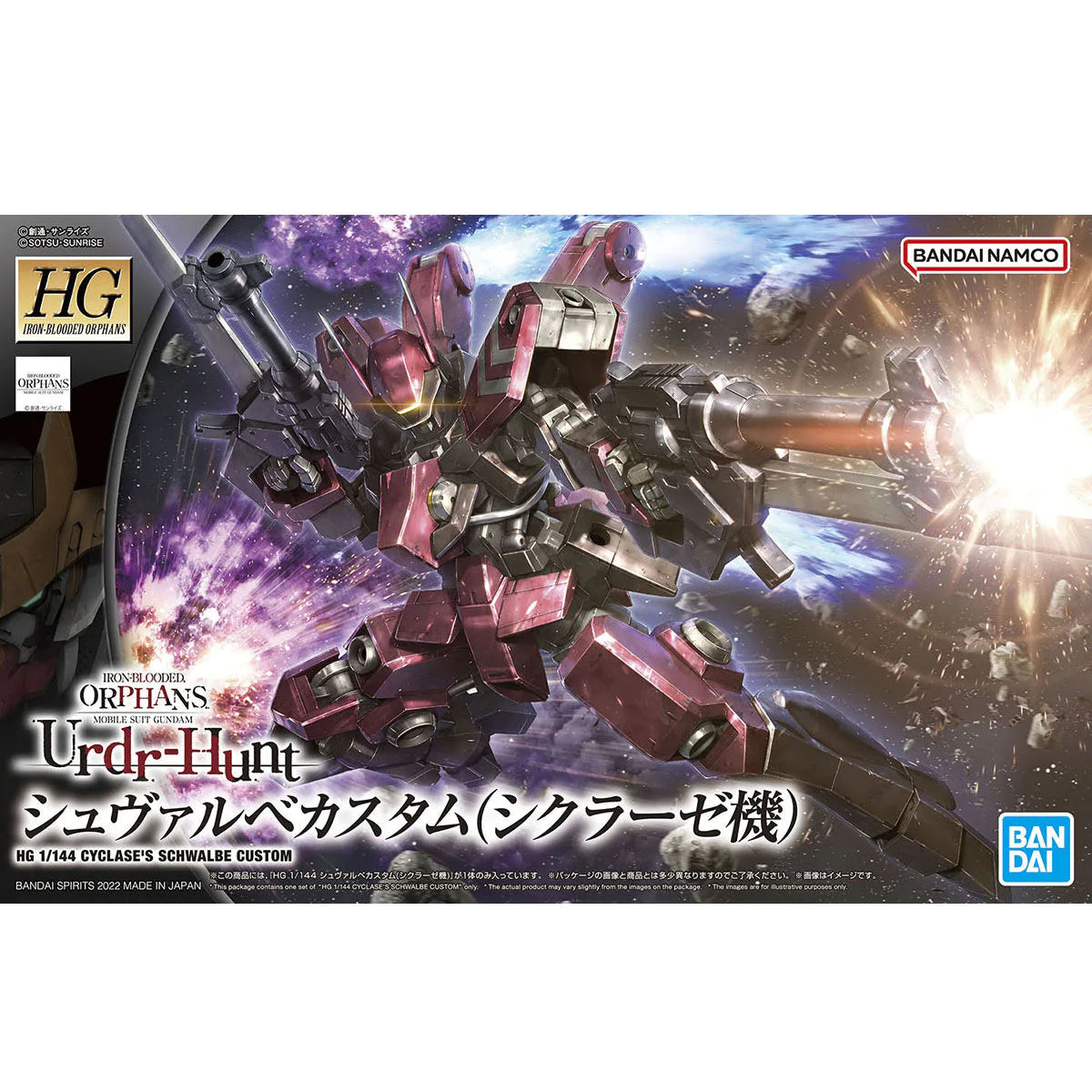 Based on the Mobile Suit Gundam IRON-BLOODED ORPHANS Urdr-Hunt mobile game, this Schwalbe Custom (Cyclase) model kit is in the 1/144 scale and becomes a fully articulated figure once built.