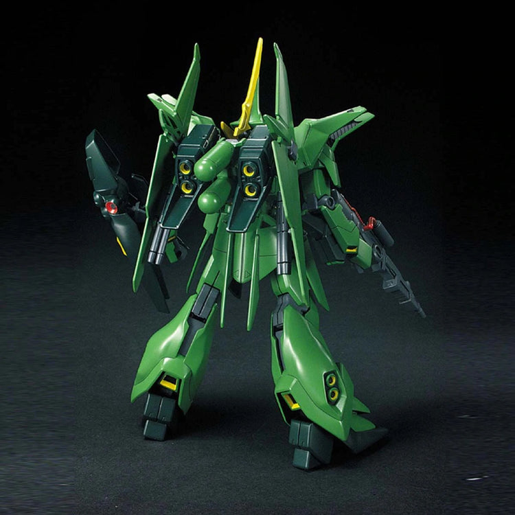 The AMX-107 Bawoo makes its (re)appearance in 1/144 scale in the HGUC line, this time molded in green instead of red! This kit transforms from flight to fight mode just like it does in Gundam ZZ. Accessories include a beam saber and rifle as well as interchangeable hand parts.