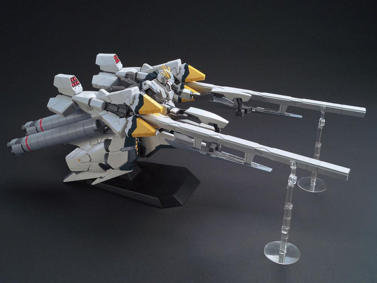 A test type unit created exploring technologies that would eventually lead to the Nu Gundam, the Narrative Gundam from "Gundam NT" is featured here with its A-Packs equipment used in Operation Phoenix Hunt." Narrative features new articulation gimmicks in its construction and features a large amount of detail from molded missiles in the missile pod hatches to large propllant tanks and beam effects. Included are 2 beam sabers, dedicated display stand, stands for its cannons, and effect parts.
