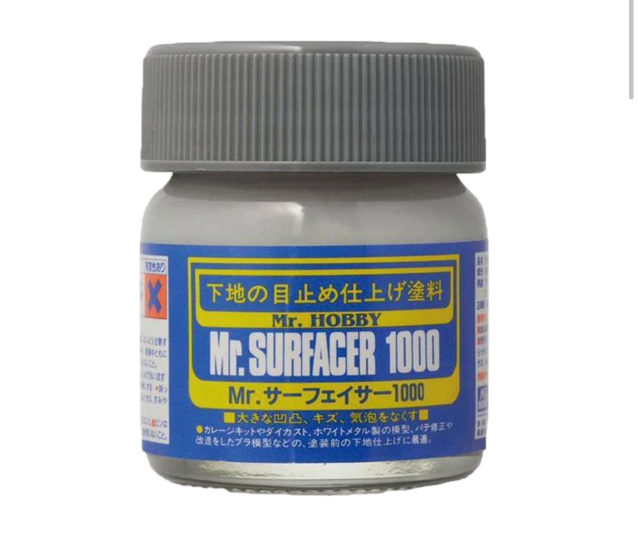 Mr. Surfacer 1000 contains finer granules than Mr. Surfacer 500 and is useful for filling in bumps, dents, scratches, for removing bubbles and finishing bases. Can be diluted with either Mr Thinner or Mr Levelling Thinner. With the finer granules after sanding with waterproof sand-paper, a perfectly corrected surface is possible.