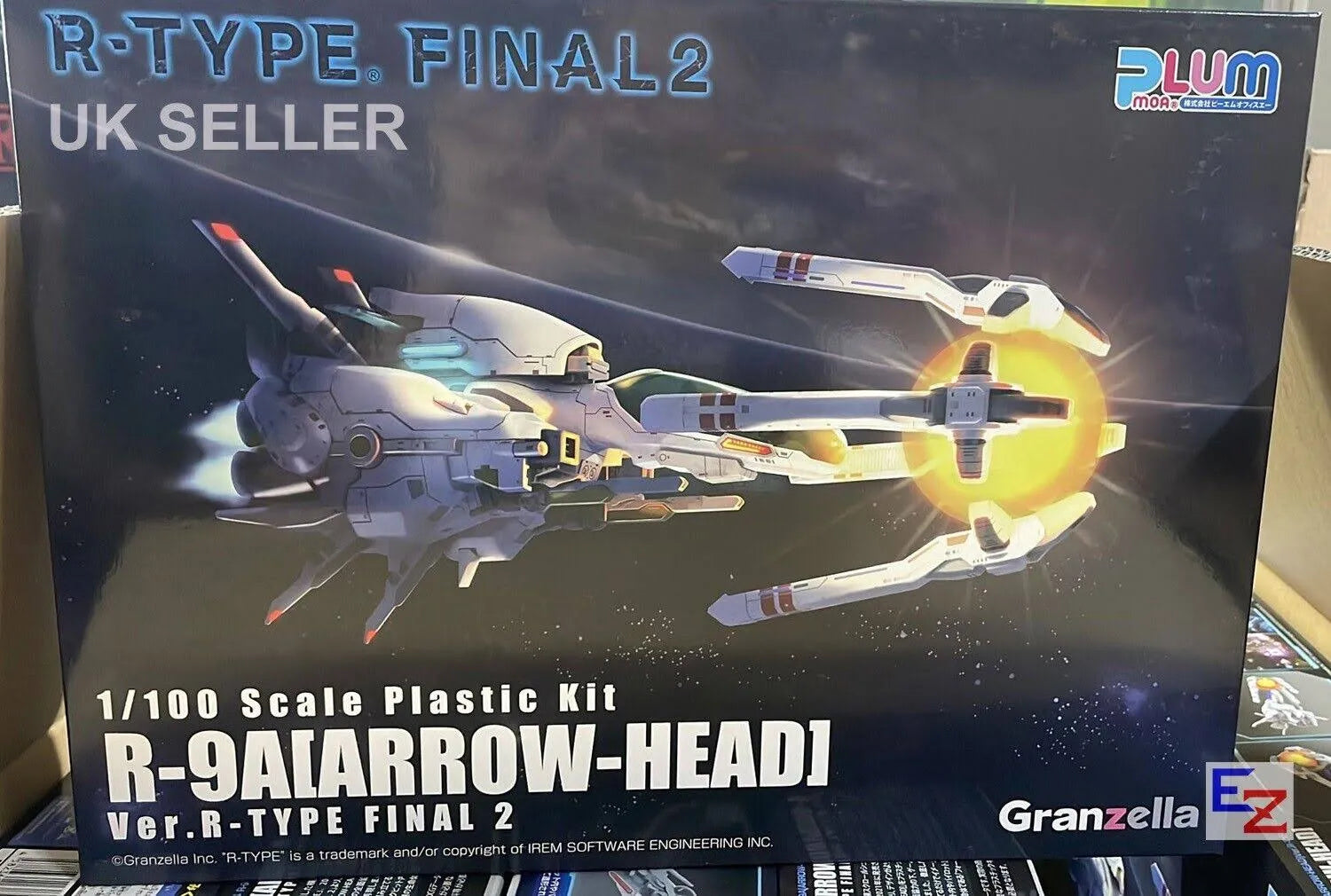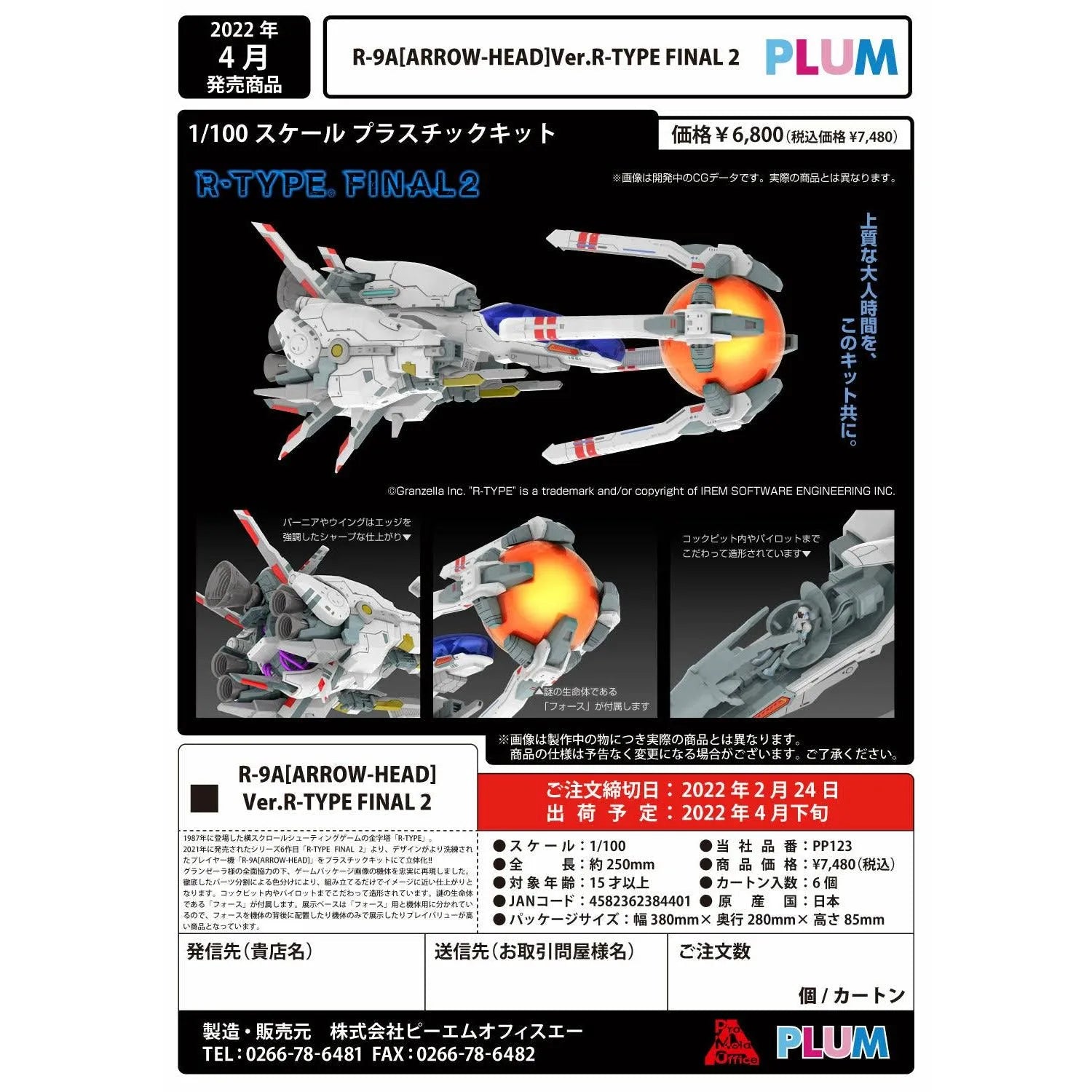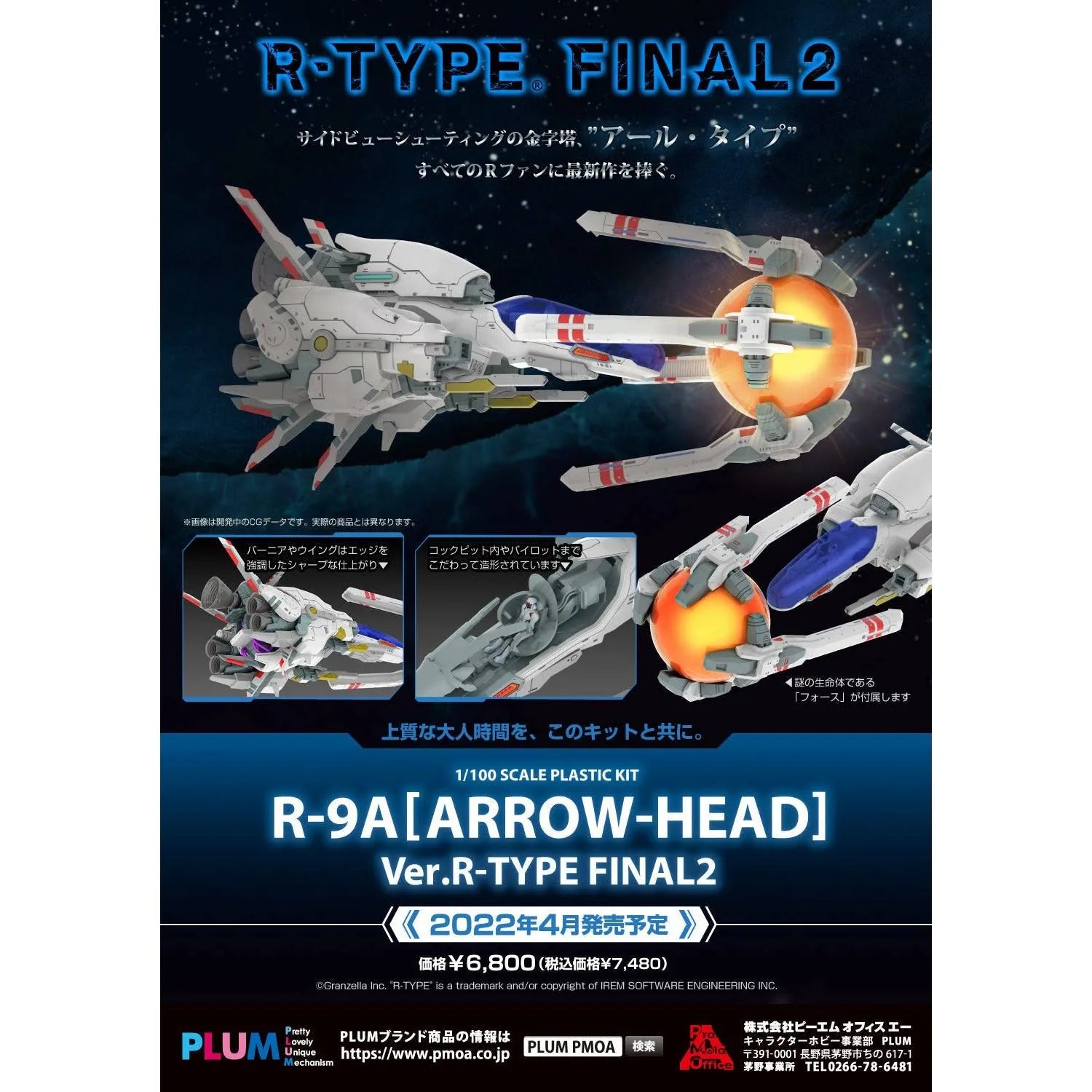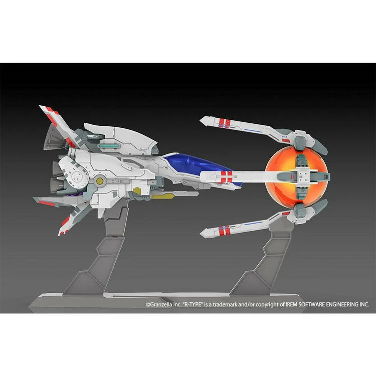 The iconic side-scrolling shooting game "R-Type" debuted in 1987; the sixth game in the series, "R-Type Final 2," was released in 2021. This model kit assembles into an accurately detailed replica of the R-9A [Arrow Head] from the game! The parts are molded in color, so you can get a result close to that seen in the game just by assembling it; it's molded in great detail, too, down to the cockpit and the pilot. The mysterious life form Force is included too, and the display base features separate supports for the R-9A [Arrow Head] and Force.