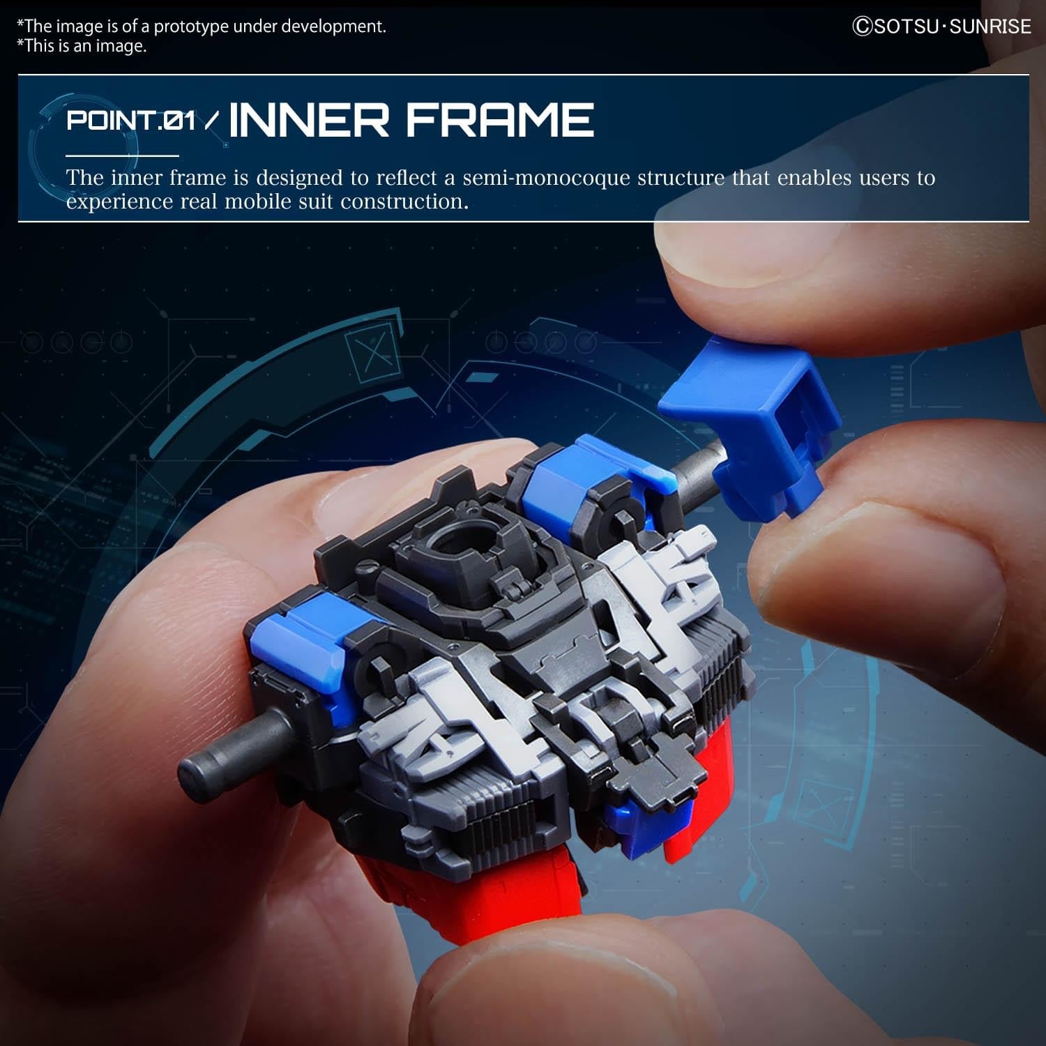 The latest designed internal frame is inspired by a semi-monocoque structure, allowing you to relive the construction of a mobile suit. The joint structure, which returns to the original design, has a new structure in which 'the parts that look like joints bend properly" by reinterpreting the movable axis. The legs are a reconsideration of the "hand-to-hand combat MS Gundam" and use composite frame joints to draw an outline similar to that of a human when it moves.