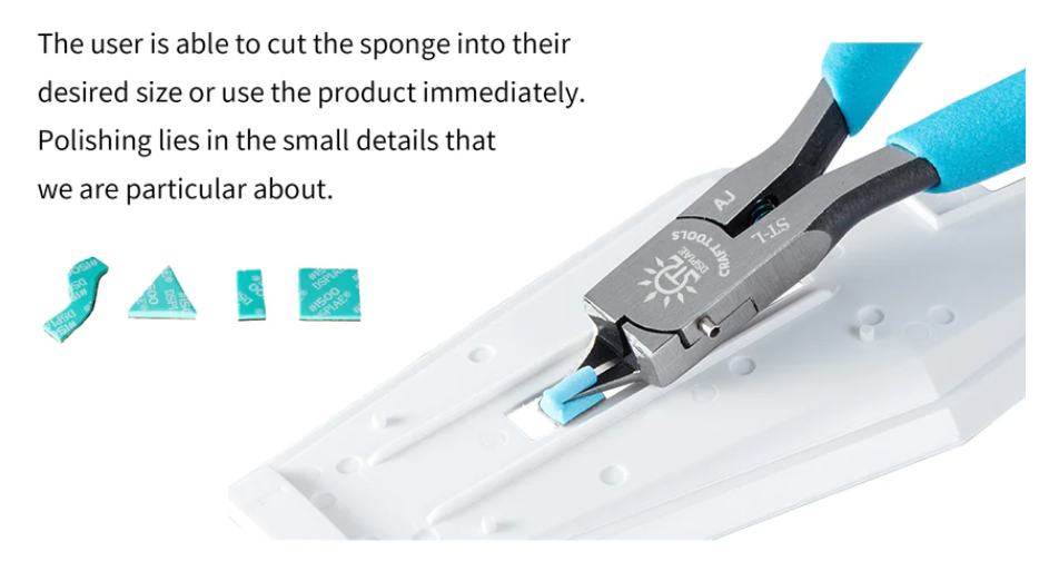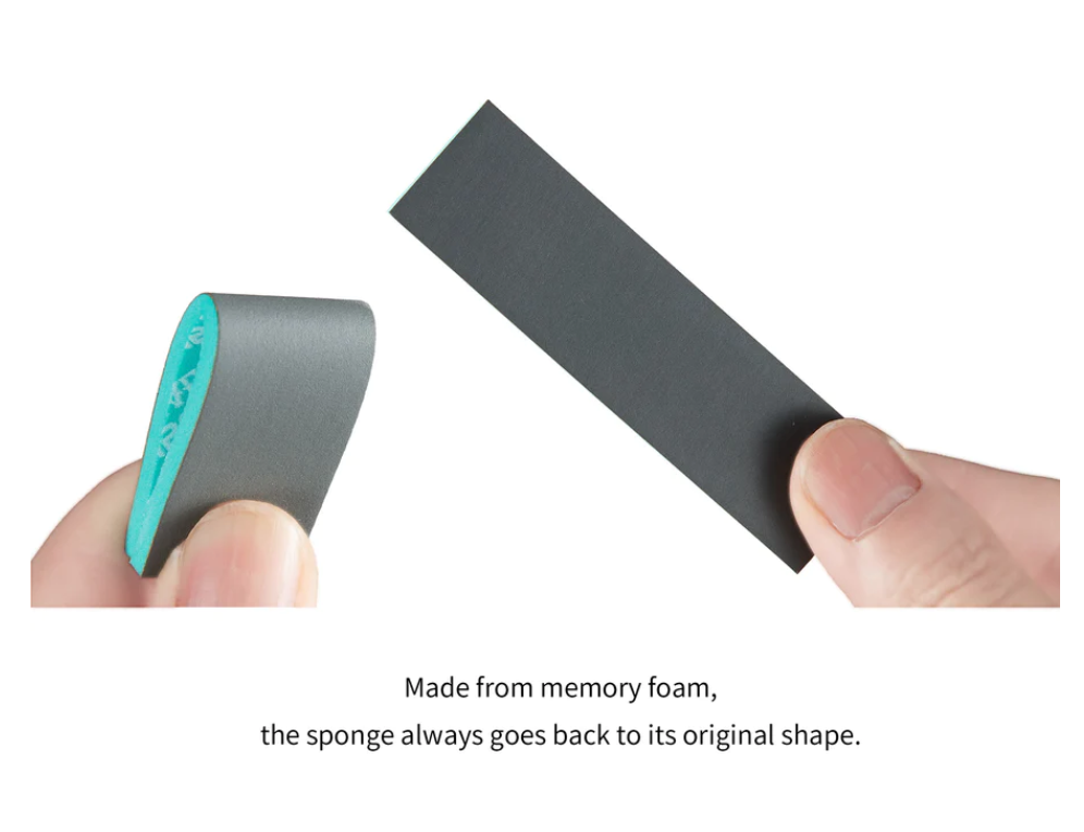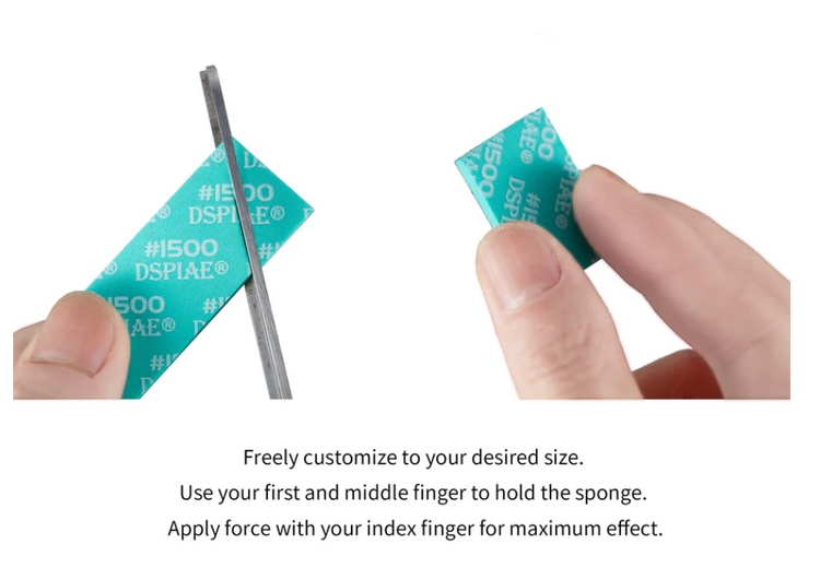 The user can use coarse grits on pieces that require less precision in the sanding. The sanding block is made from EVA material that is soft and flexible, perfect for sanding curved edges. The grits are color coded, making it easy to distinguish. Grits are labeled clearly at the back, allowing users to choose their tools without hassle. With three thickness to choose from, it is versatile for any situation. Every set comes with 2 of each thickness for each grit. The user is able to cut the sponge into their desired size or use the product immediately. Freely customize to your desired size. Use your first and middle finger to hold the sponge. Apply force with your index finger for maximum effect. Made from memory foam, the sponge always goes back to its original shape.