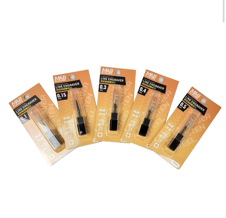Madworks Tungsten Steel Engraver Chisel is suitable for science fiction and military models in all scales. This tool does not include a handle. The cutter design is shorter and more convenient to use. It can be used for general plastic models (ABS/PVC), polyester resin, and epoxy resin.