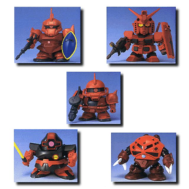 Here's a fun combo pack from over 20 years ago! It features the adorable BB Senshi / SD G Generation versions of Char's custom mobile suits: the Z'Gok, Zaku II, Rick Dom, Gelgoog, and the Casval Gundam are all here in their cutest forms.