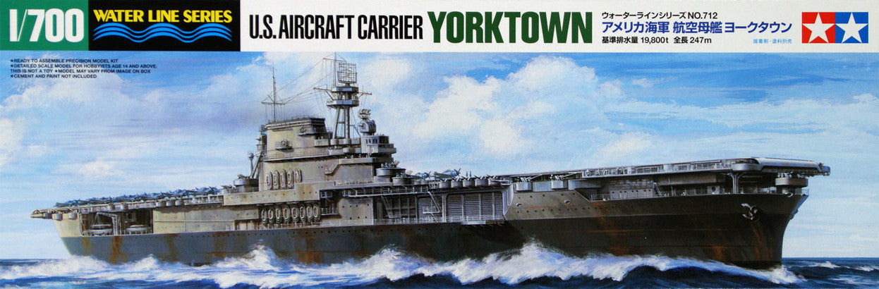 The USS Yorktown was completed in September 1937 as the first ship of her namesake-class and the U.S. Navy's sixth aircraft carrier. When the Pacific War broke out, she became the flagship of Task Force 17 under the command of Rear Admiral Frank J. Fletcher and conducted a number of operations around the Pacific. During the Battle of the Coral Sea in May 1942, she helped thwart the Japanese Navy's advance on New Guinea despite suffering severe damage. Subsequently, at the Battle of Midway, the Yorktown and her sister ships USS Enterprise and USS Hornet defeated the Japanese Mobile Fleet, but the Yorktown herself suffered severe damage by torpedo and bomb hits from the aircraft of the Japanese carrier Hiryu. She was finally sunk by torpedoes from the Japanese submarine I-168. The Tamiya 1/700 scale model is a precise replica assembly kit of this iconic carrier during WWII.
