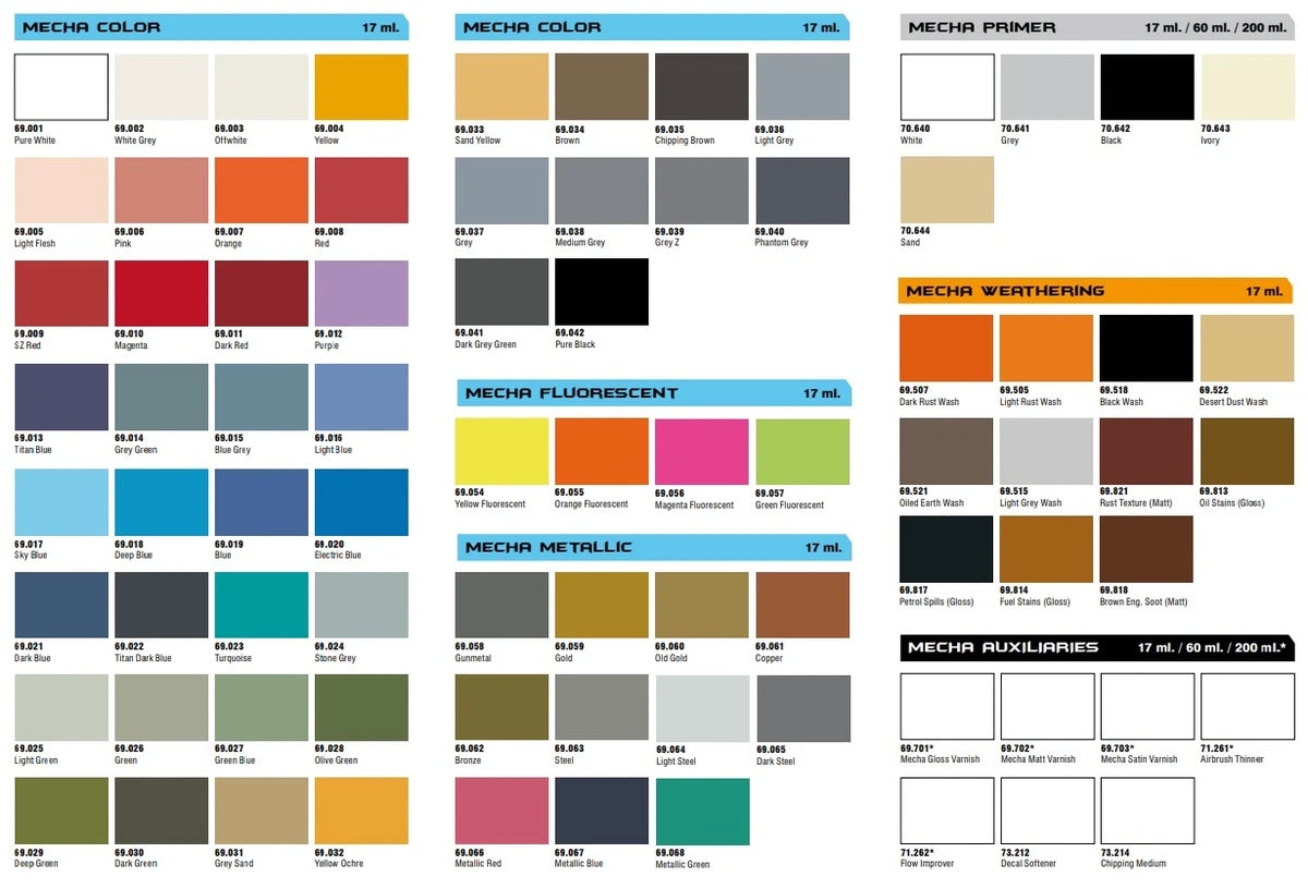 Packaging: Mecha Color is available in 17 ml./0.57 fl.oz. bottles (with eyedropper). Mecha Primer and Mecha Varnish are also available in 60 ml./2.02 fl.oz. and 200 ml./6.76 fl.oz. bottles (with flip top and eyedropper).