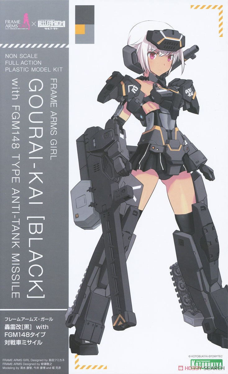 The latest addition to the spin-off series of Kotobukiya’s original Frame Arms robot series, Frame Arms Girl, is GOURAI-KAI [BLACK] with an FGM148 TYPE ANTI-TANK MISSILE! Little Armory’s “FGM148 Type Anti-Tank Missile” made by TOMYTEC can be equipped to Gourai-Kai’s back allowing her to engage in medium and long-range combat. This model comes to life based on an illustration by Humikane Shimada where Takayuki Yanase’s Frame Arms Gourai-Kai mecha design is transformed into an original female character!
