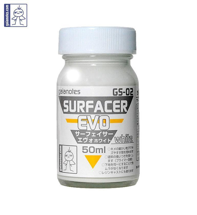 Surfacer / Primer for plastic model kits and resin garage kits. Fill fine scratches and gaps with fine particles. Improves paint adhesion. Creates a uniform base for even finishes. Can be used with resin garage kits. Before application, remove mold release, oil, dust, etc from your desired surface. Please mix well before use for best results. Change your Gaia Notes Thinner depending on your application. T-01 Thinner, T-06 Brush Master (Self Levelling), or T-07 Moderate Thinner (reduced odor) This can also be used as a primer for resin garage kits to improve paint adhesion and to fill sanding marks. Volume: 50 ml (1.7 oz)