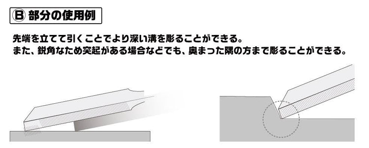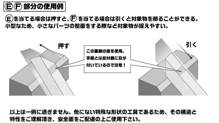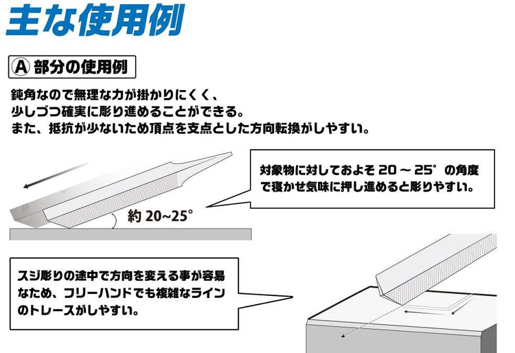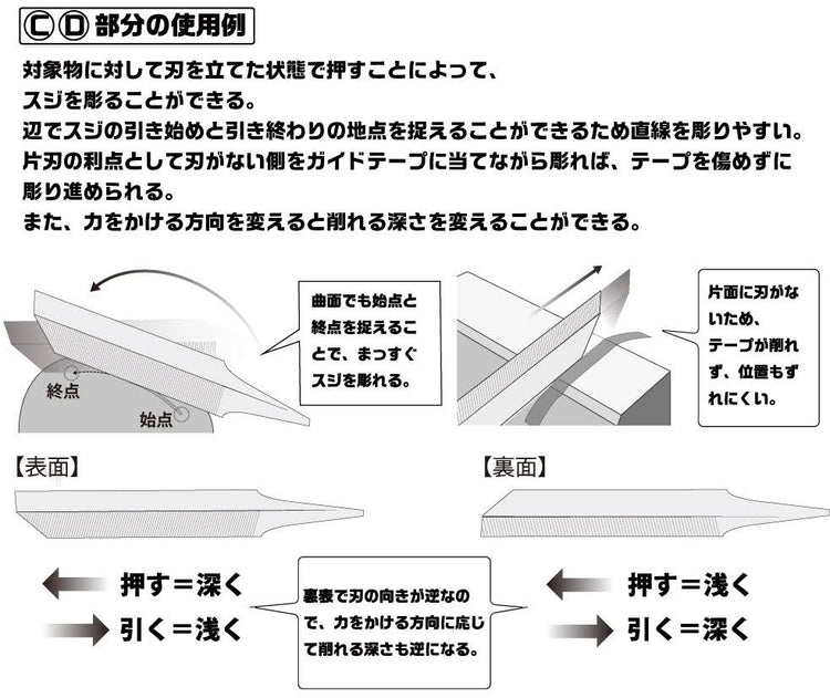 Extra small-sized file specialized for scribing lines! Different from normal mill file, special structure of one-sided file. You can scribe finer line compare with double sided one. Also by adjusting your strength, you can scribe both thick and thin lines. Design of edge dropped structure. Less resistance let you change a direction easily. It's easy to hold because of the wooden grip and great for filing panel lines even though those on rounded edges.