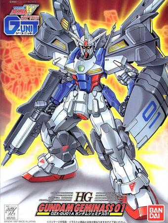 High Grade Gundam Wing Dual Story G-Unit Series - Scale: 1/144 - Franchise: New Mobile Report Gundam Wing Dual Story: G-Unit. - Release Date: June 1997. - Includes Gundam Geminass 01 Standard configuration parts: Shoulder armors, Calf armors Space configuration parts: Shoulder armors, Calf armors, Backpack, Accelerate Rifle, G-UNIT Shield, 2 Beam Swords - Kit Features & Gimmicks Elbow and knee joints can be bent up to 90 degrees. The lower elbow joints can swivel. Shoulder thrusters can pivot up and down on each piece. Rear boosters can pivot up or down. Accelerate Rifle can store inside the shield.