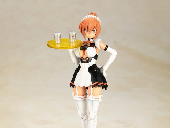 This base model of GaoFighGar features a tall, well-proportioned build and the model can be recreated in her suit or a maid outfit. Three pre-painted face parts are included (Shouting, Default, Smiling) along with a Protect Wall-shaped tray, Robo Juice from the series, decals for the eyes and five sets of PVC hand parts. The PVC hands and 3mm connection points are compatible with existing weapons from the Frame Arms Girl, M.S.G, and Frame Arms series.