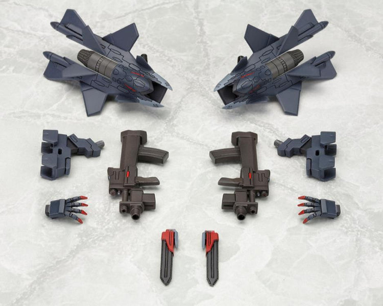 The black body and scarlet illuminated parts that made this TSF so ominous in the anime are faithfully recreated. Removable motor blades for both arms and open hand parts for recreating attack scenes are also included. The characteristic folding blades on the heels are movable and can be extended. The two standard A-97 Assault Cannons included with this model can not only be held in both hands but also attached to the weapon mounts on the back. As the right shoulder is tampo printed with the emblem and the head is pre-painted, Su-47E can be recreated just by assembling the model. A clear blue version of the illuminated parts is also included.