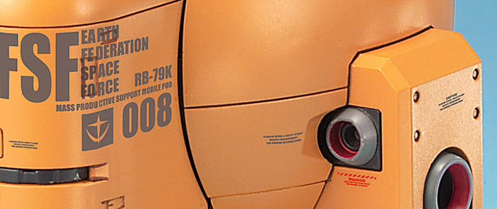 Get excited, everybody, it's the 08th MS Team version of the Ball!! Featuring all the same snap-fit assembly we've come to expect from Bandai, bits and bobs that into the average MG kit, plus stickers for warnings all over, it's sure to be an attention-grabber in anyone's home. Okay, I admit, I'm stretching for things to say. It's a Ball. It's a Master Grade Ball, to be specific. There are no clear panel parts as shown in the photos from Shizuoka. Excellent detail all over, though, and of course it's armed with 180mm cannons.