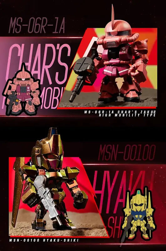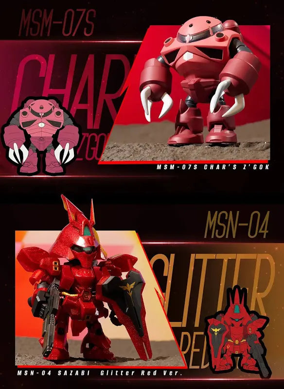 Uniquely stylized static figures with impressive volume of 4” tall, featuring different variations of the mobile suits piloted by the ace pilot of the Principality of Zeon, Char Aznable. This version feature Gundams from the classic Mobile Suit Gundam anime series.