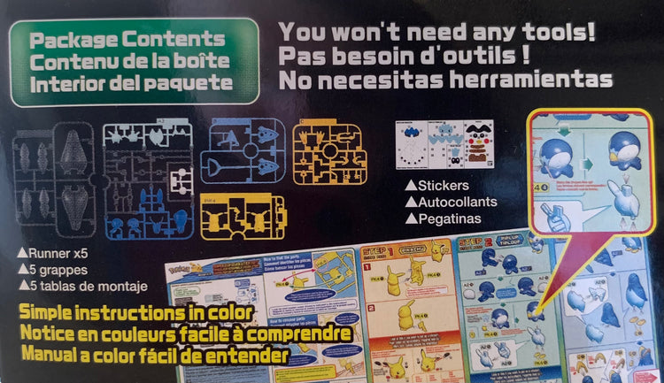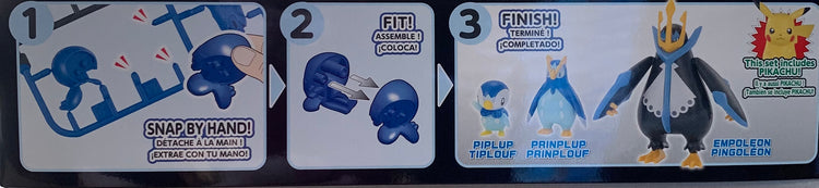 This simple snap-fit plastic kit set allows modelers to build Pikachu and three evolution forms of Empoleon , consisting of Piplup, Prinplup, and Empoleon. All parts come molded in color and a sheet of stickers is provided for detail so no painting is required.