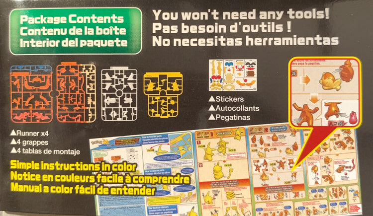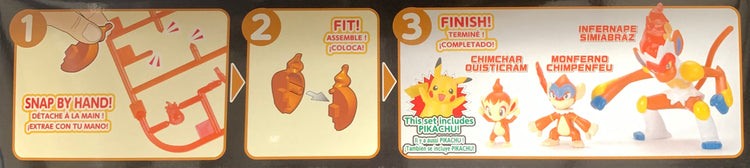 This simple snap-fit plastic kit set allows modelers to build Pikachu and three evolution forms of Infernape, consisting of Chimchar, Monferno, and Infernape All parts come molded in color and a sheet of stickers is provided for detail so no painting is required.