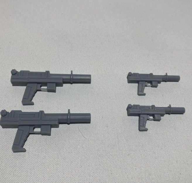 1/144 or 1/100 Stripped beam pistols as seen in the Universal Century timeline in Mobile Suit Gundam. This weapon is notably used by the GM Nightseeker but works great with any kit. The kit comes with two pistols to get the best dual-wielding poses you can imagine.