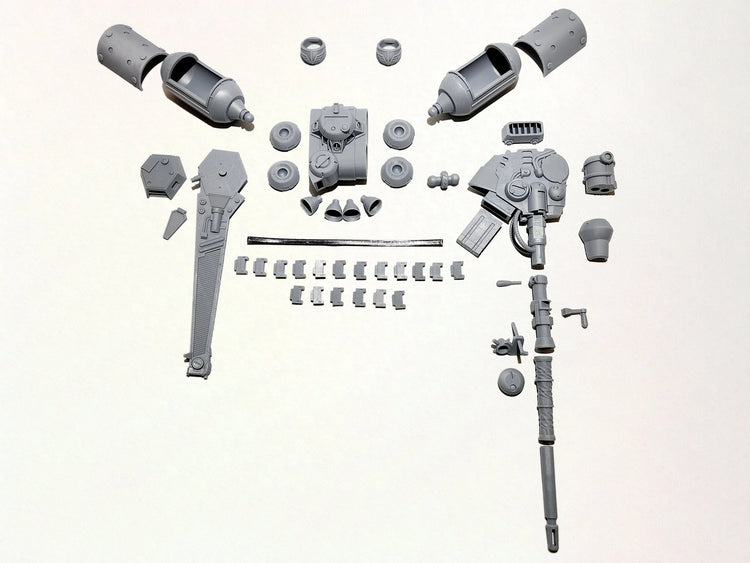 The kit is entirely 3D printed using resin with the exception being the 3D printed rubber-like material for the flexible ammo chute. The kit is made up of 50 individual pieces and requires assembly (superglue recommended for final assembly).