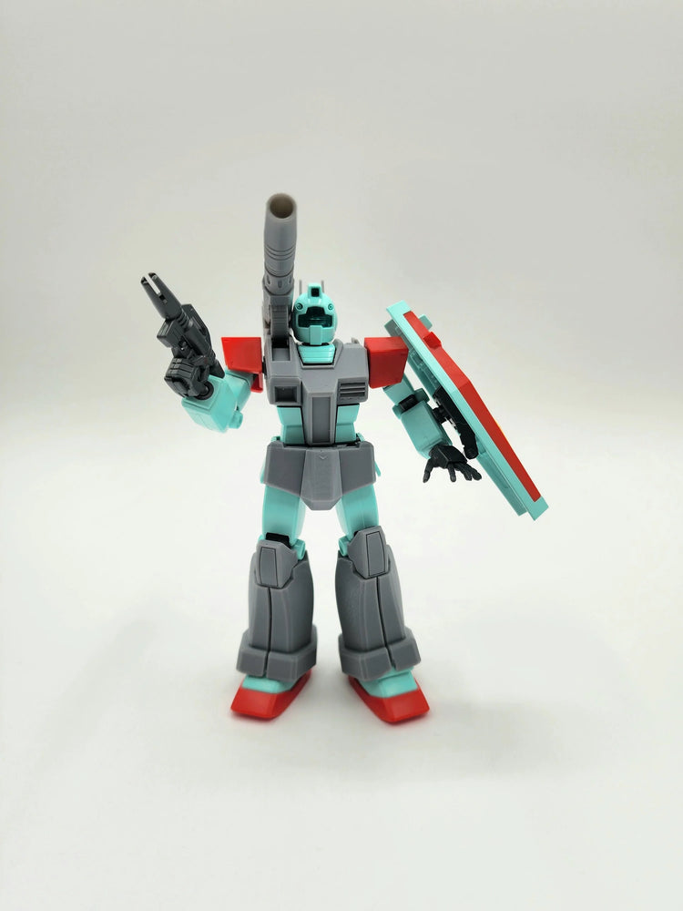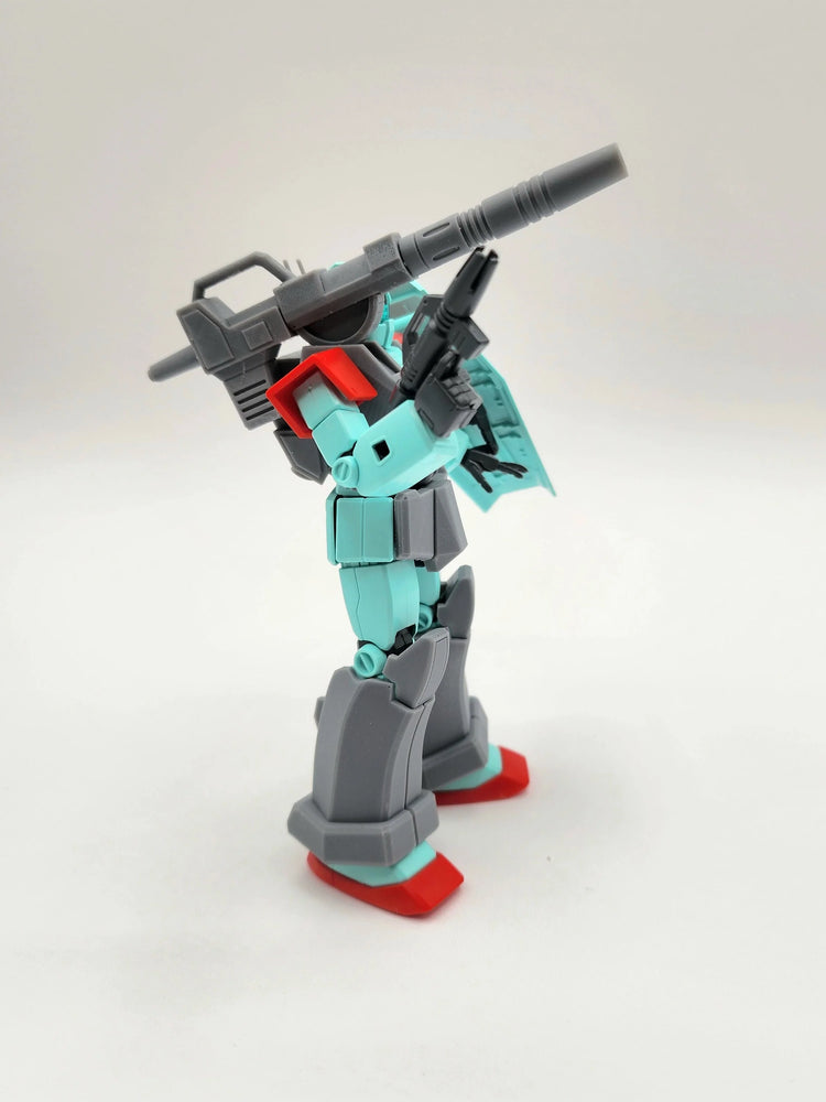 Ever get that feeling that your grunts could use a little heavy support? Now's your chance! The 1-144 GM Cannon conversion kit takes the1-144 HGUC GM kit (HGUC-20) and turns up the ordnance. Much like the description in MSV, these conversion parts either clamp on existing kit parts or replace them. The leg armor clamps on top of the kit leg and ankle armor, allowing for a good range of foot motion, but notably shifting the center of mass downwards for a more stable firing platform.