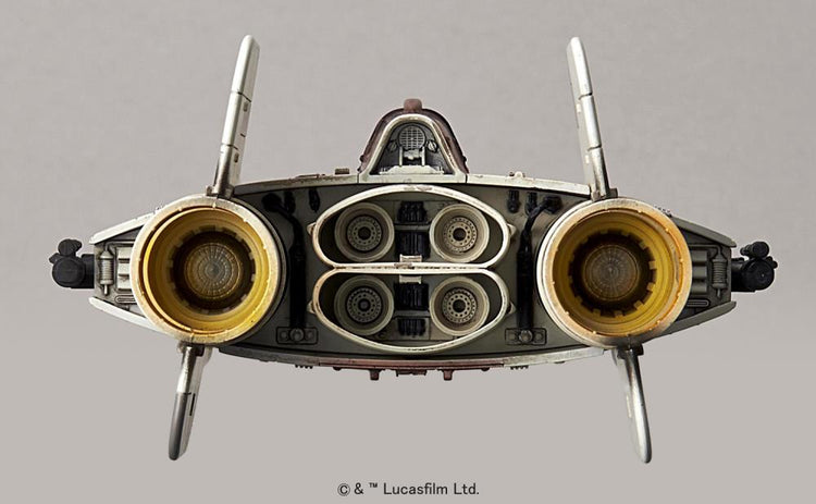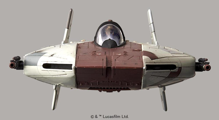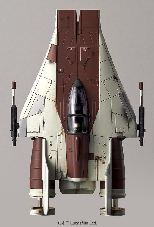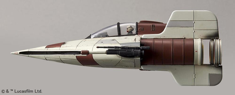 The A-Wing star fighter from the Star Wars universe has been faithfully recreated as a 1/72 scale model kit utilizing Bandai's patented four color injection process that allows for construction of highly detailed parts that are color molded reducing the need for paint.