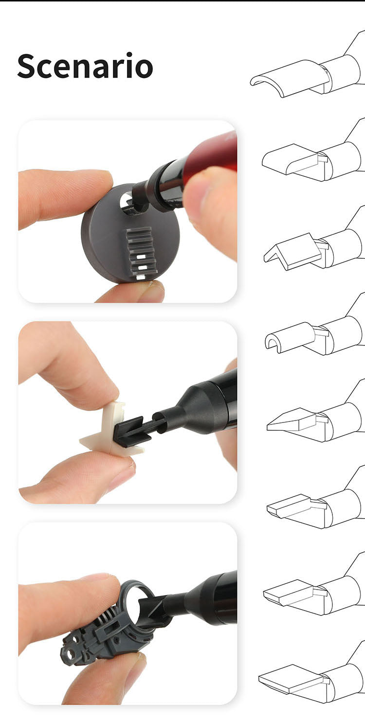 It is a reciprocating sander featuring several heads of different shapes. It allows you to sand parts you cannot easily do with rotary tools—and, of course, much more conveniently than with sanding sticks.