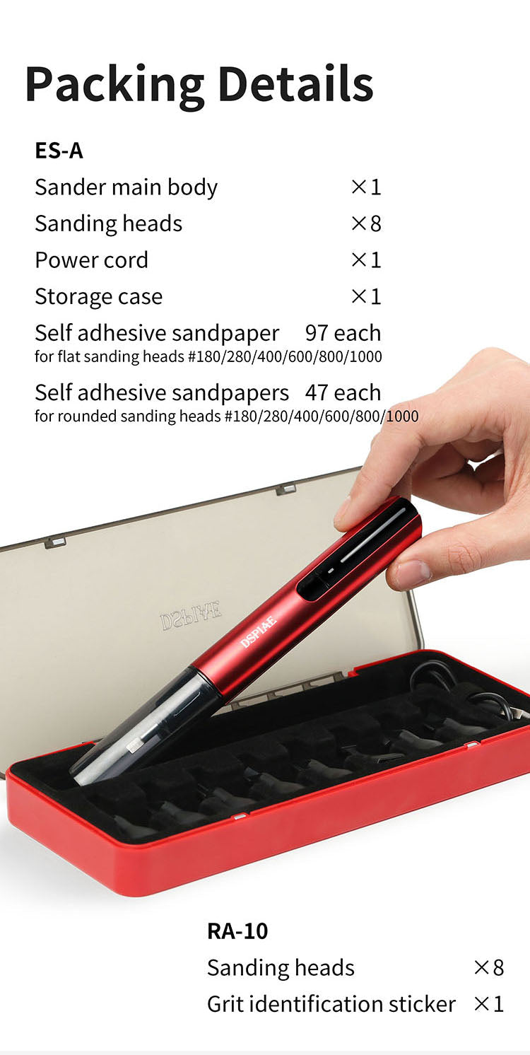 The base set includes the sander, charging cable, 8 heads, and a vast array of sanding papers.