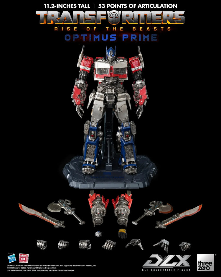 The "Transformers: Rise of the Beasts" DLX Optimus Prime stands approximately 11.2 inches tall, with 53 points of articulation, and contains an intricate alloy skeleton that provides a high-quality tactile feel with ample amounts of articulation. The joint design is carefully crafted with interlinking level of detail for a near seamless appearance.