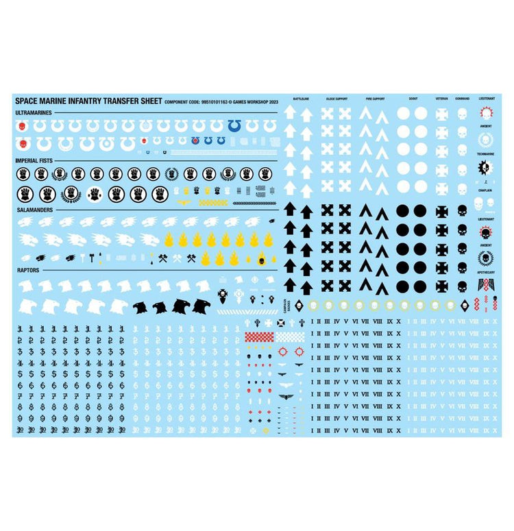 This set comprises 218 plastic components and is supplied with 10x Citadel 28.5mm Round Bases. This set also includes 1x Space Marines Transfer Sheet containing 758 high-quality waterslide transfers, and 2x Raven Guard Primaris Transfer Sheets, each containing a further 93 high-quality waterslide transfers for you to use to decorate your models.