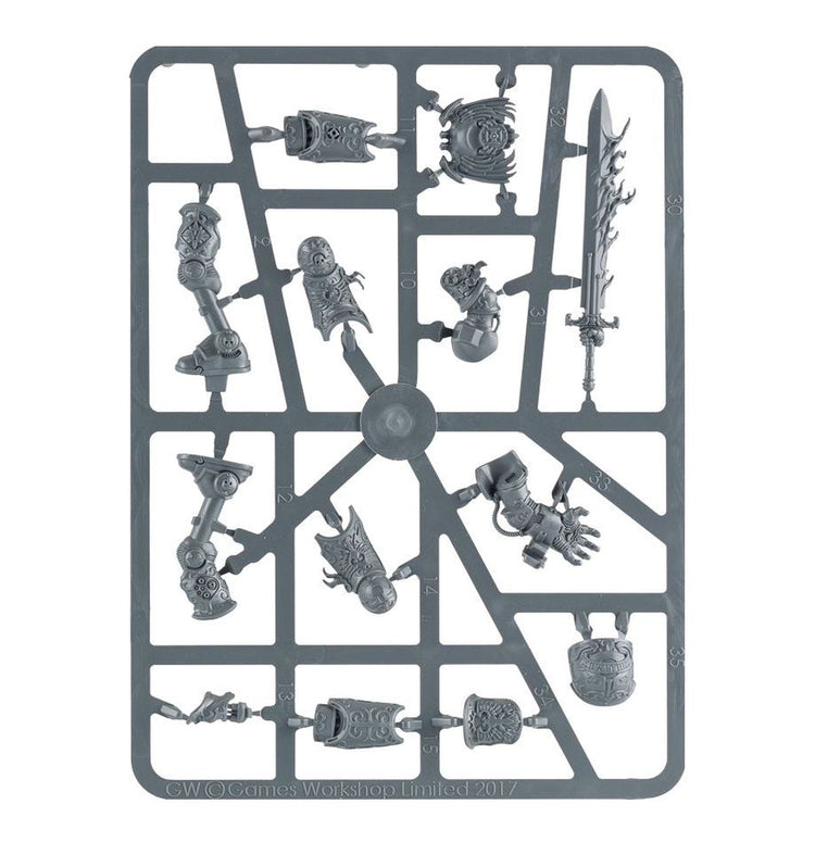 This multi-part plastic kit contains the components necessary to assemble Roboute Guilliman, Primarch of the Ultramarines. An impressively-sized model, standing head and shoulders above the Primaris Space Marines, he is a riot of detail – the Armour of Fate that encases his body is covered in beautiful, ornate filigree patterns on every part of the armour, with sculpted aquilæ, purity seals, skulls and Ultramarine Chapter icons on every surface. His winged backpack features an Adeptus Mechanicus maker’s plate and glorious iron halo, with many cables and hoses attaching it to the weaponry it feeds. The Emperor’s Sword, held in his right hand, is a huge blade that burns with righteous fury (and fire), while the Hand of Dominion, the enormous gauntlet on his left, is also capable of unleashing hails of armour piercing gunfire. You have the choice to model Guilliman with his head bare, or with an especially aggressive-looking helmet – both options feature a wreath.